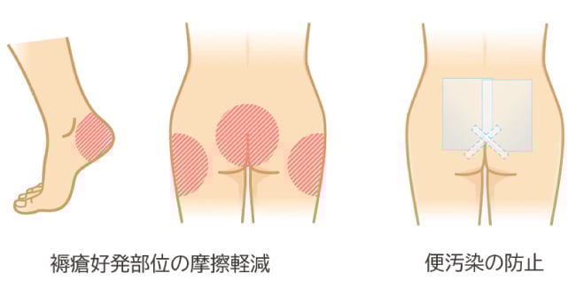 薄膜敷料可以像手术胶带一样,用于固定纱布和垫子。此外,通过将纱布整体覆盖并贴上薄膜敷料,可以实现良好的防水效果。以前在洗澡时担心纱布和伤口会被水弄湿,但现在使用薄膜敷料可以放心。②「褥疮(压疮)的对策」