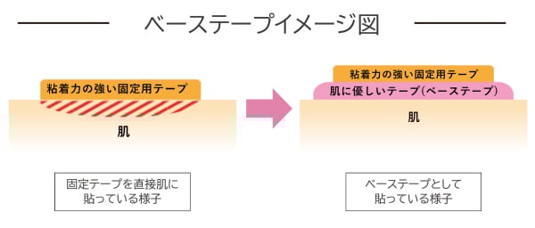 basesilon 是一种在固定导管等时使用粘着力强的胶带,并在其下贴上薄膜敷料的使用方法。(如果作为 basesilon 使用,请选择剥离刺激较少的薄膜敷料。)通过预先贴上剥离刺激较少的薄膜敷料,可以减轻剥离时对皮肤的负担。④其他用途
