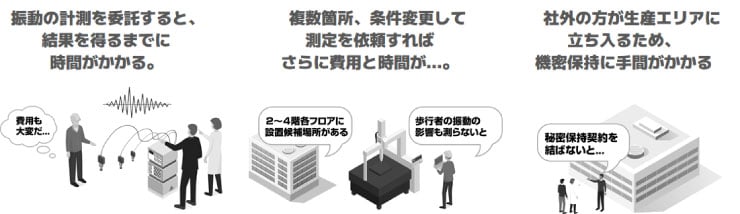 到目前为止,委托专业公司进行测量,“一切交给他们”让人感到安心……■委托调查后,从获得结果到需要花费时间和费用。■如果增加测量点或更改测量条件进行测量,将进一步增加费用和时间……。■由于外部人员需要进入生产区域,因此需要花费时间进行机密保持。 振动测量难吗?介绍一种“自己尝试做”的振动测量方法!