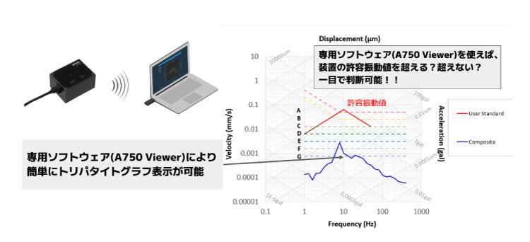 計测结果在现场立即可视化!!・通过专用软件(A750 Viewer(※1))可以轻松显示三相相位图(※2)・通过专用软件,可以测量值与“振动水平”、“设备的允许规格值”进行比较和验证(※1):A750 Viewer可以从专用网站免费下载(※2)三相相位图:在同一个图表上显示①频率(Hz)-速度(m/s)、②频率(Hz)-加速度(gal)、频率(Hz)-位移(μm)的三个图表。便于振动状态的分析。 推荐商品