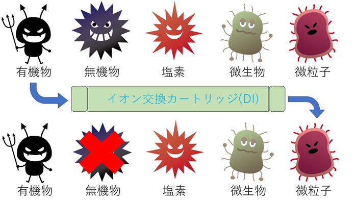 如下面所示,自来水中存在许多杂质,但通过第二个设置的反渗透膜,大部分杂质可以被去除。然而,反渗透膜对氯气很敏感,因此在第一个位置放置含有活性炭的预处理滤芯,可以完全去除氯气。通过反渗透膜无法充分去除的有机物,可以使用紫外线灯大部分去除。去除过程中,部分有机物电离并产生无机物。因此,最后放置离子交换滤芯,以排除剩余的无机物。经过这四个步骤,超纯水才得以完成。