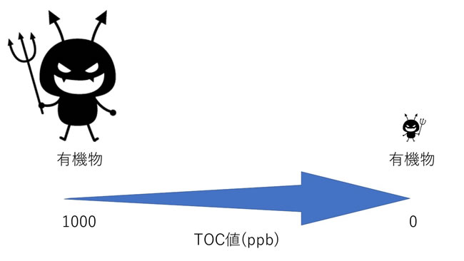 ・TOC(Total Organic Carbon):表示水中碳的总量(有机物量)。有机物通过波长比用于杀菌的紫外线(254 nm)更短的紫外线(185 nm)进行分解。在分解过程中产生的二氧化碳溶解在水中,从而在照射前后产生比电阻值的差异,通过这个差异计算出TOC值。TOC值越小,表示溶解在水中的有机物量越少。在超纯水中常用的单位主要是ppb。