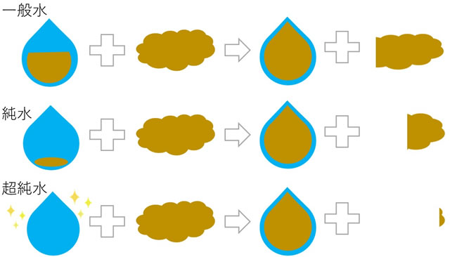 纯水・超纯水是从自来水中去除杂质的水。换句话说,由于通常溶解的杂质不存在,因此对器具的杂质溶解能力提高了。
