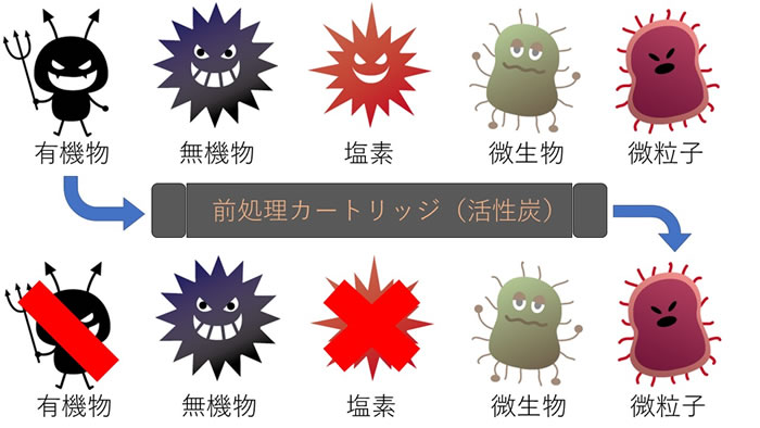 预处理滤芯用于去除自来水中多余的氯。用于游泳池消毒的氯含量在自来水中超过0.1ppm。虽然保持水质重要,但在制造超纯水的过程中,由于不纯物的存在,需要被去除。此外,如后所述,反渗透膜是能够去除95~99%的有机物、无机物、微粒子和微生物的优秀方法,但对氯非常敏感,去除能力会显著降低。因此,预处理滤芯安装在最开始,以保护反渗透膜免受氯的侵害。