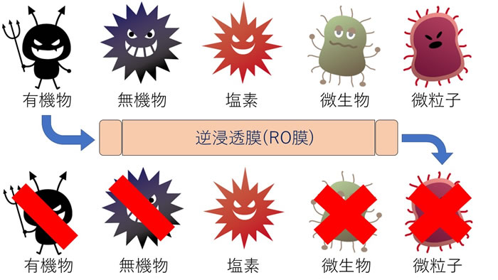 在浓度高的溶液侧施加压力,通过膜将水精炼到浓度低的一侧,可以去除95~99%的有机物、无机物、微粒子和微生物。只需将活性炭和反渗透膜(RO膜)连接,即可去除许多杂质,因此用RO膜精炼的水被称为RO水,属于纯水级别。此外,由于水的通过速度会因水温而变化,RO水的生产量规格栏中会注明“25℃”等水温。